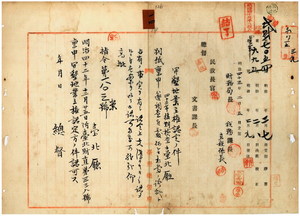 一四 台北庁長井村大吉ヨリ稟申ノ台北庁下ノ金包里堡頂中股庄土名林口ノ許妹・許抱ノ田、石碇堡瑪陵坑庄土名東勢上股ノ陳烏獅ノ田、同堡同庄土名東勢中股ノ周南ノ田、同堡友蚋庄土名赤皮湖ノ蘇万成ノ田、同堡友蚋庄土名港口ノ高胖ノ田、三貂堡三叉港庄土名三叉港ノ林崇厚・林渕潭・林崇明、同堡武丹坑庄土名頂坪ノ呂阿松・呂万章、同堡同庄土名粗坑ノ羅王ノ田、同堡同庄土名武丹坑ノ連現和、連水茂、何景ノ田、同堡柑脚庄土名柑脚ノ江新水、黄先振ノ田、同堡頂双渓庄土名九份坑ノ連肖杜ノ田、文山堡太平庄土名竹仔山ノ蘇添旺ノ建物敷地ト田、同堡同