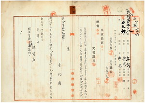 一二 台北庁長井村大吉ヨリ稟申ノ興直堡三重埔庄土名大竹囲ノ業主ヲ陳作車カラ陳作淦ヘ、文山堡大坪林庄土名宝斗厝ノ業主ヲ林木生カラ翁林木生ヘ、同堡同庄同土名ノ業主ヲ翁木生カラ翁林木生ヘ、芝蘭二堡和尚洲水囚庄ノ業主ヲ陳必楽カラ陳百禄ヘノ土地台帳登録氏名訂正方認可ノ件