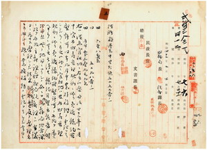 五 阿緱庁長佐藤謙太郎ヨリ稟申ノ同庁港西中里彭厝庄ノ潘襟・潘春長ノ畑、港東上里樸仔脚庄ノ劉連・潘順枝ノ田、港東中里打鉄庄ノ李幾法ノ田、港東下里水底リョ庄ノ陳添ノ畑ノ官租地除却方認可ノ件(指令第四三五五号)