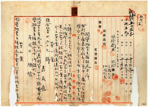 一三 嘉義庁長北原種忠ヨリ稟申ノ同庁下ノ游巧・黄明譲・黄明再・黄明火ヘ嘉義東堡下六庄土名司公謙ノ畑、褪添生・翁達芳・管理翁宗濶ヘ同堡石頭厝庄ノ畑、林崇礼ヘ同堡柚仔宅庄ノ畑、沈永ヘ同堡深坑庄ノ田、謝在・謝明月・謝徳信・謝伝富・謝連・謝存賢・謝リョ・謝喜・謝呆・謝其・謝渓・謝明月・謝徳信・謝文淵・謝在・謝明月・謝徳信・謝リョ・謝呆・謝喜・謝其・謝渓・謝伝富・謝○○ヘ嘉義東堡後大埔庄ノ田ト建物敷地、江○○・江五世・江長・陳嗣昌・黄随・劉和尚ヘ嘉義西堡紅毛課庄ノ田・畑・建物敷地、陳朝宗・鄧喜ヘ打猫東下堡葉仔リョ庄