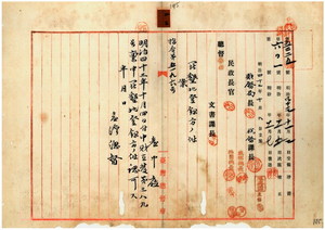 二三 台中庁長枝徳二ヨリ稟申ノ糖業奨励規則ニ依リ業主権ヲ付与サレタ同庁東螺東堡鼻仔頭庄ノ陳炳文ノ畑、東螺西堡潮洋厝庄ノ陳紹年ノ田・畑、二林下堡万合庄ノ陳宗ノ畑ニ係ル開墾地登録認可(指令第五一九六号)ニ係ル同年一〇月四日付中財直発第三八九号稟申書添付書中地番訂正方認可ノ件(指令第五六七九号)