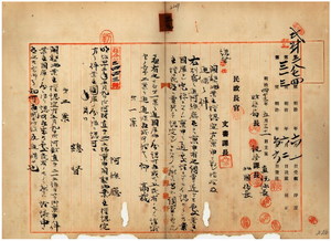 三〇 阿緱庁長佐藤謙太郎ヨリ稟申ノ同庁港東中里新課頭庄ノ国庫ニ係ル田・畑ノ開墾地業主権認定方認可(指令第三四四三号)並ニ港西上里新威庄ノ業主ヲ蕭氏冉妹ノ田、邱黄氏対妹ノ畑ニ係ル開墾地業主権ヲ認定方認可(指令第三八五八号)ノ件