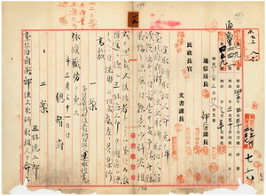 一九 台北府前街郵便受取所取扱人速水経憲ノ辞職願ニ依リ職務ヲ免シ(三月三一日付)三好徳三郎ニ同受取所取扱人ヲ命ス(四月一日付)