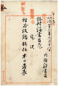 五 台湾総督府民政部殖産局代理峡謙斉ノ具申ニ依リ農商務技師樫谷政鶴ヲ台湾総督府技師ニ任シ民政部殖産局ヲ命ス