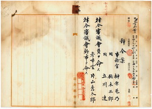 一三 律令審議会議長ノ内申ニ依リ台湾総督府事務官ノ榊原毛乃・鈴木三郎・立川連ニ律令審議会員ヲ命シ、台湾総督府参事官片山秀太郎ニ律令審議会幹事ヲ命ス