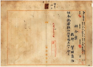 二〇 台湾総督府民政部殖産局長代理峡謙斉ノ具申ニ依リ台湾総督府技師賀田直治ニ恒春熱帯植物殖育場主任ヲ命ス