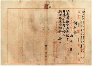 五七 新竹郵便局長岩下巳之助ノ内申ニ依リ新竹郵便局勤務台湾総督府通信事務員山本一男ヲ台湾総督府通信手ニ任シ新竹郵便局勤務ヲ命ス