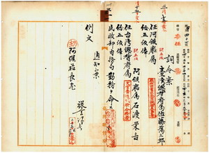 三一 台湾総督府民政部内務局長川村竹治ノ内申ニ依リ台湾総督府属佐藤藹三郎ヲ阿緱庁属ニ任シ、阿緱庁属石渡栄吉ヲ台湾総督府属ニ任シ民政部内務局勤務ヲ命ス