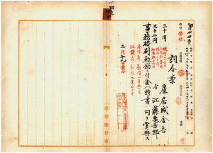 四三 台湾総督府民政部殖産局長代理峡謙斉ノ具申ニ依リ製茶試験場勤務台湾総督府雇ノ居城金吉・江藤亀吉郎ニ事務格別勉励ニ付キ一時金ヲ賞与ス