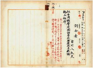八四 台湾総督府中学校長本荘太一郎ノ上申ニ依リ東京高等師範学校数物化学部卒業予定者古川八太夫ヲ台湾総督府国語学校助教授兼教諭ニ任ス[八二も見よ]