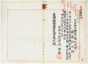 二一 財務局長代理峡謙斉ノ内申ニ依リ台湾総督府属霜村平助ヘノ俸給ヲ官租改正調査費ヨリ支弁ヲ府費俸給諸給ヨリ支弁ニ支出科目変更ノ件