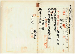 三二 台湾総督府蕃務本署長大津麟平ノ内申ニ依リ東京帝国大学仏法律科卒業ノ松野常也ヲ台湾総督府警部ニ任シ民政部蕃務本署勤務ヲ命ス