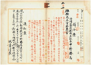 一一 脚気トノ理由ヲ以テ差出サレタル鳳山公学校勤務台湾公学校教諭兼校長中野勝馬ノ辞職願ト之ヲ容認スル台南庁長松木茂俊ノ退官聴許方並ニ昇級及賞与ノ儀ハ内情調査シタル処本官並ニ兼官ヲ免スルトスルモ昇級及賞与ハ詮議相成ストスノ件(78~84)