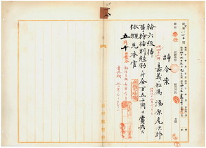 一八 嘉義庁属湯原虎次郎ノ疾病辞職願ニ依リ昇級ノ上事務格別勉励ニ付キ一時金ヲ賞与シ本官ヲ免ス(110~115)