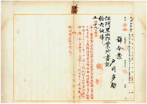 五七 台湾総督府阿里山作業所長心得峡謙斉ノ内申ニ依リ元鉄道院書記戸川多助ヲ阿里山作業所書記ニ任ス(357~367)