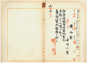 七〇 台南医院長氏原均一ノ内申ニ依リ当院書記野口録太郎ノ後任トシテ台湾総督府民政部財務局勤務台湾総督府雇中田三省ヲ台湾総督府医院書記ニ任シ台南医院勤務ヲ命ス(431~435)