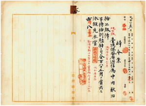 一九 新竹郵便局勤務台湾総督府通信属中内猷治ハ疾病ニ罹リ職ニ堪ヘタル旨ヲ以テ辞職願ニ依リ昇級ノ上事務格別勉励ニ付キ一時金賞与シ本官ヲ免ス