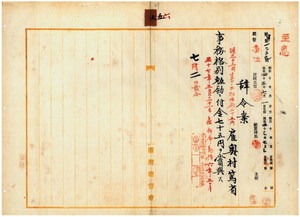 六 台湾総督府民政部内務局長川村竹治ノ内申ニ依リ疾病ニ罹リ職ニ堪ヘサル旨ヲ以テ辞職ヲ願出タル台湾総督府雇奥村篤省ニ事務格別勉励ニ付キ一時金ヲ賞与ス