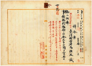 七 台湾総督府民政部財務局長心得峡謙斉ノ内申ニ依リ病気危篤ノ台湾総督府属渋谷誠ニ昇給並ニ事務格別勉励ニ付キ一時金ヲ賞与ス