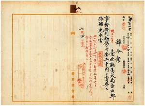 九 台北庁属大島吉次郎ハ疾病ニ罹リ職ニ堪ヘサル旨ヲ以テ辞職願ニ依リ事務格別勉励ニ付キ一時金ヲ賞与シ本官ヲ免ス