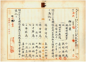 一四 台湾総督府民政部内務局長川村竹治ノ内申ニ依リ台湾総督府視学官ノ小川尚義・渡部春蔵・台湾総督府国語学校教授森川正雄・台湾総督府視学山口喜一郎ニ明治四三年開設台湾公学校教員講習会講師ヲ嘱託シ、台湾総督府属ノ長谷八太郎・松山捨吉・台湾総督府技手二瓶士子治・台中庁属ノ鈴木稲作・阪上椿蔵・台南庁属ノ小池忠晃・喜多村孝弘ニ明治四三年開設台湾公学校教員講習会事務ヲ嘱託ス