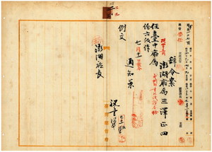 二三 台中庁長枝徳二ト澎湖庁長横山虎次ノ内申ニ依リ澎湖庁属三沢正四ヲ台中庁属ニ任ス