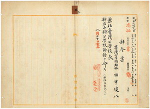 三 台北庁長井村大吉ノ内申ニ依リ枋橋公学校土城分校勤務台湾公学校教諭田中健八ヲ台湾公学校長ニ兼任シ新庄山脚公学校勤務ヲ命ス