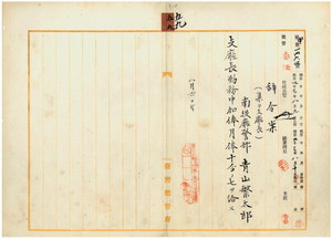 南投廳警部青山繁太郎支廳長勤務中加俸ノ件