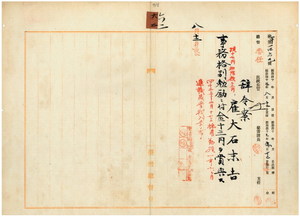 六二 台湾総督府民政部殖産局長代理川村竹治ノ具申ニ依リ殖産局勤務台湾総督府雇大石末吉ニ事務格別勉励ニ付キ一時金ヲ賞与ス