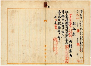 五 台北監獄長台湾総督府典獄志豆機源太郎ノ内申ニ依リ台北監獄看守ニテ土語通訳兼掌ノ西村甚吉ヲ台湾総督府監獄監吏ニ任シ台北監獄勤務ヲ命ス(37~40)