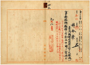 四三 台湾総督府民政部通信局長持地六三郎ノ内申ニ依リ台北測候所勤務台湾総督府測候所技手大隈鴻一ハ別途休職ヲ命シタルニ依リ事務格別勉励ニ付キ一時金ヲ賞与ス(174~175)