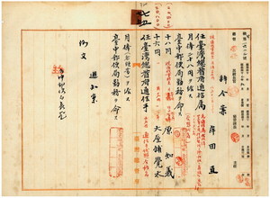 七五 台中郵便局長野村勘四郎ノ内申ニ依リ台湾総督府通信書記台中郵便局通信事務員牟田亘ヲ台湾総督府通信属ニ任シ台中郵便局勤務ヲ命シ、明治四二年九月実施ノ通信手試験ニ合格シタル台中郵便局通信事務員兼通信助手大屋鋪覚太ト草鞋墩郵便出張所勤務台中郵便局通信事務員原知義ヲ台湾総督府通信手ニ任シ台中郵便局勤務ヲ命ス(辞令日の記載なし、320~328)