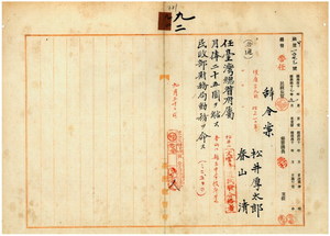九二 台湾総督府民政部財務局長心得峡謙斉ノ内申ニ依リ東亜同文書院ニ留学シ明治四二年台湾総督府文官普通試験ニ合格シタル台湾総督府雇ノ松井厚太郎ト鹿児島県立加治木中学校卒業シ台湾総督府雇ノ春山清ヲ台湾総督府属ニ任シ民政部財務局勤務ヲ命ス(381~384)