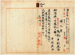 九六 台湾総督府民政部殖産局長代理峡謙斉ノ具申ニ依リ熱帯植物ニ関スル事務ヲ嘱託シタル台湾総督府嘱託中村辰治ヲ御用済ニ付キ解嘱託シ次デ同中村辰治ニ桑苗養成ニ関スル事務ヲ嘱託シ民政部殖産局勤務ヲ命ス(397~398)