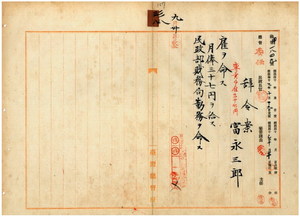 三八 台湾総督府民政部財務局長中川友次郎ノ内申ニ依リ元専売局雇経理課勤務富永三郎ニ雇ヲ命シ民政部財務局勤務ヲ命ス