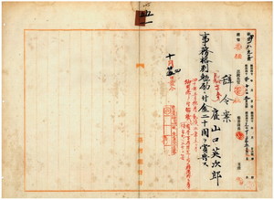 五一 台湾総督府民政部通信局長持地六三郎ノ内申ニ依リ御用済解職トナリタル元民政部通信局雇山口英次郎ニ在職中事務格別勉励ニ付キ一時金ヲ賞与ス