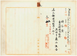 九 斗六郵便局長大津延吉ノ内申ニ依リ台北郵便局勤務台湾総督府通信手森山熊吉ニ斗六郵便局勤務ヲ命ス
