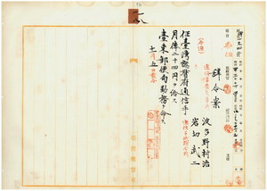 一八 台東郵便局長鈴木重嶽ノ内申ニ依リ通信手試験合格ノ台東郵便局勤務通信事務員兼通信助手ノ波多野村治ト岩切武二ヲ台湾総督府通信手ニ任シ台東郵便局勤務ヲ命ス