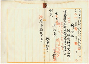 三六 台南郵便局長曽祢吉弥ノ内申ニ依リ病気危篤ニ陥リタル台湾総督府通信属神崎寅太郎ヘ事務格別勉励ニ付キ一時金ヲ賞与ス