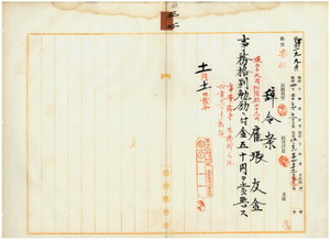三七 台湾総督府民政部財務局長中川友次郎ノ内申ニ依リ脚気ニ罹リ職ニ堪ヘサル旨ヲ以テ辞職願提出済ノ台湾総督府民政部殖産局勤務台湾総督府雇張友金ヘ事務格別勉励ニ付キ一時金ヲ賞与ス