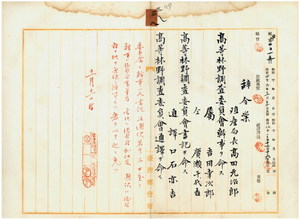 三八 台湾総督府民政部殖産局長高田元治郎ニ高等林野調査委員会幹事ヲ命シ、台湾総督府属ノ吉田幸次郎ト広瀬千代吉ニ高等林野調査委員会書記ヲ命シ、台湾総督府通訳口石亦吉ニ高等林野調査委員会通訳ヲ命ス