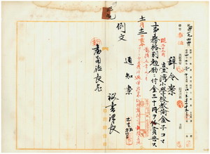 三九 台南庁長松木茂俊ノ稟申ニ依リマラリヤニ罹リ職ニ堪ヘサル旨ヲ以テ辞職願提出済ノ鳳山尋常高等小学校港仔茄分教場勤務台湾小学校教諭金子コマヘ事務格別勉励ニ付キ一時金ヲ賞与ス