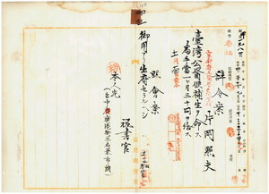 四三 台湾総督府民政部内務局長亀山理平太ノ内申ニ依リ京都府立医学専門学校卒業台湾鹿港開業医ノ片岡照夫ニ台湾公医候補生ヲ命ス