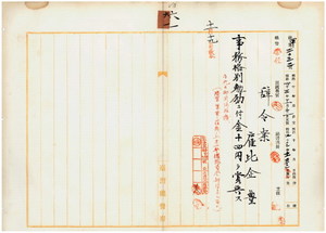 六一 台湾総督府民政部通信局長代理鈴木三郎ノ内申ニ依リ陸軍軍曹復職ノ上第一次守備隊司令部付トナル為メ明治四三年一一月一九日付辞職ノ雇比企豊ヘ事務格別勉励ニ付キ一時金ヲ賞与ス