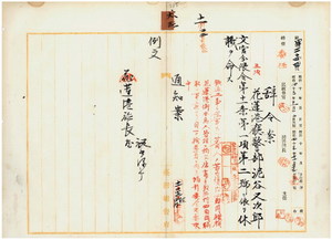 六三 花蓮港庁長石橋亨ノ内申ニ依リ花蓮港庁警部泥谷又次郎ニ鉄道工事ニ従事スル蕃人ノ苦力賃横領並ニ花蓮港街本島人管理ニ拘ハル屠畜手数料騙取ノ事実ニ依リ拘引発令方要求セラレタル為メ文官分限令第一一条第一項第二号ニ依リ休職ヲ命ス