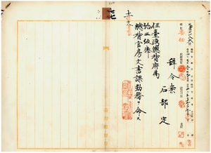 七七 台湾総督府総督官房文書課長代理片山秀太郎ノ内申ニ依リ元台中庁属石部定ヲ台湾総督府属ニ任シ台湾総督官房文書課勤務ヲ命ス