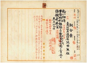 六 台湾総督府民政部通信局在勤台湾総督府通信属池田兼雄ハ疾病ニ罹リ職ニ堪ヘサル旨ヲ以テ辞表ニ依リ昇給ノ上事務格別勉励ニ付キ一時金ヲ賞与シ本官ヲ免ス