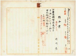 一二 台北郵便局長伊藤金弥ノ上申ニ依リ台北郵便局勤務通信助手前川長ヲ台湾総督府通信手ニ任シ台北郵便局勤務ヲ命ス