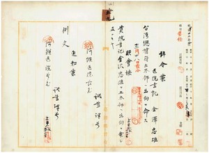 五九 台湾総督府土木部長内田嘉吉ノ照会ニ依リ阿緱医院勤務台湾総督府医院書記金沢忠雄ニ台湾総督府土木部ヘ出向ヲ命ス