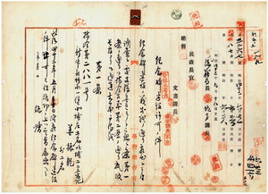 四 新竹庁竹北一堡北埔庄土名北浦総代姜振乾・徐泰新・阿部政吉ヨリ出願ノ明治四〇年一〇月一五日ニ蔡清琳以下ノ者ニ襲撃サレ職務ニ殉シタル北埔事件遭難者ノ北埔支庁長新竹庁警部渡辺亀作外一六名ノ警察官ノ為メニ新竹庁竹北一堡北埔庄土名北埔高地ニ北埔事件遭難者記念碑ヲ建設スルニ付キ許可並ニ竣工報告ノ件(指令第二八八一号)